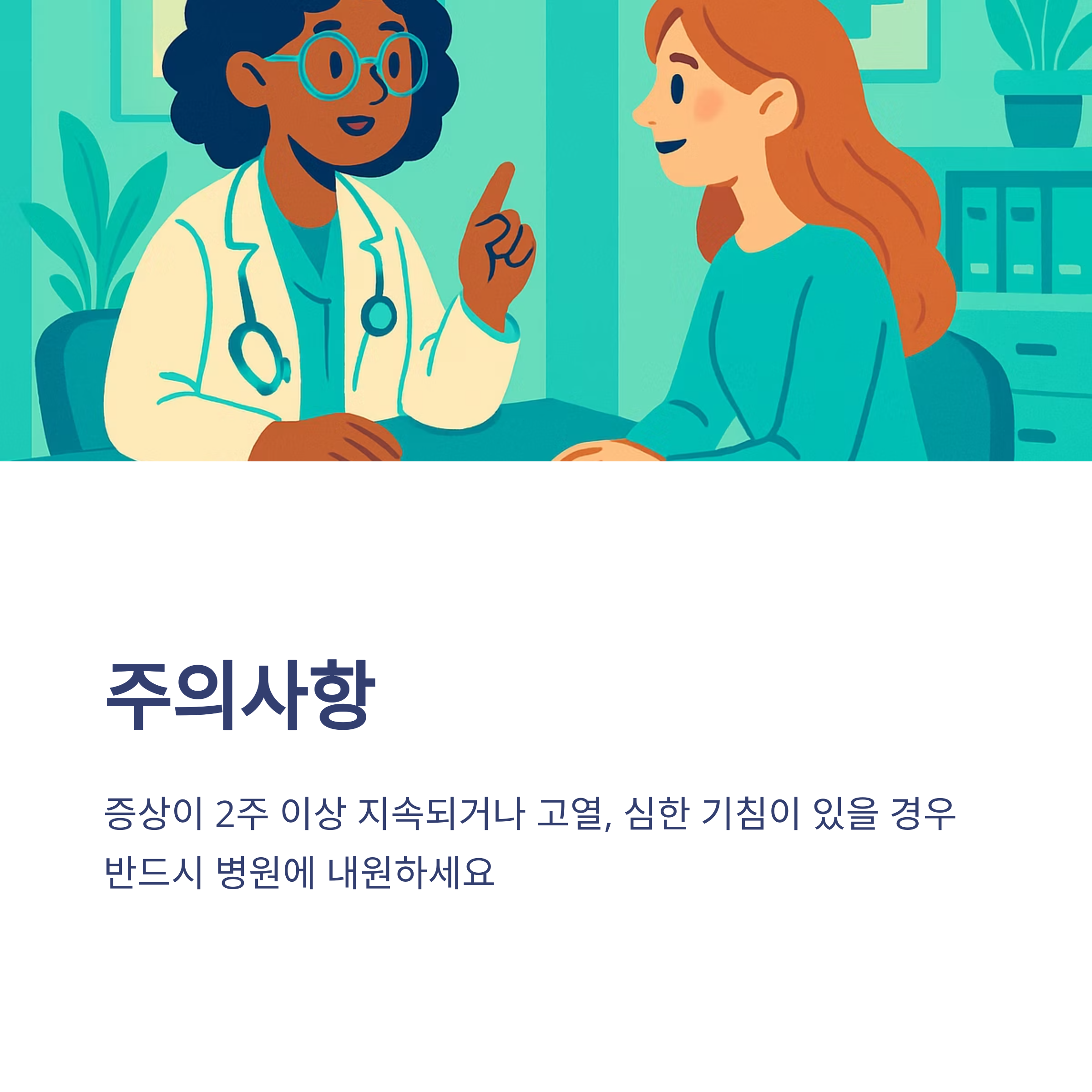 증상이 2주 이상 지속되거나 고열, 심한 기침이 있을 경우 반드시 병원에 내원하세요.