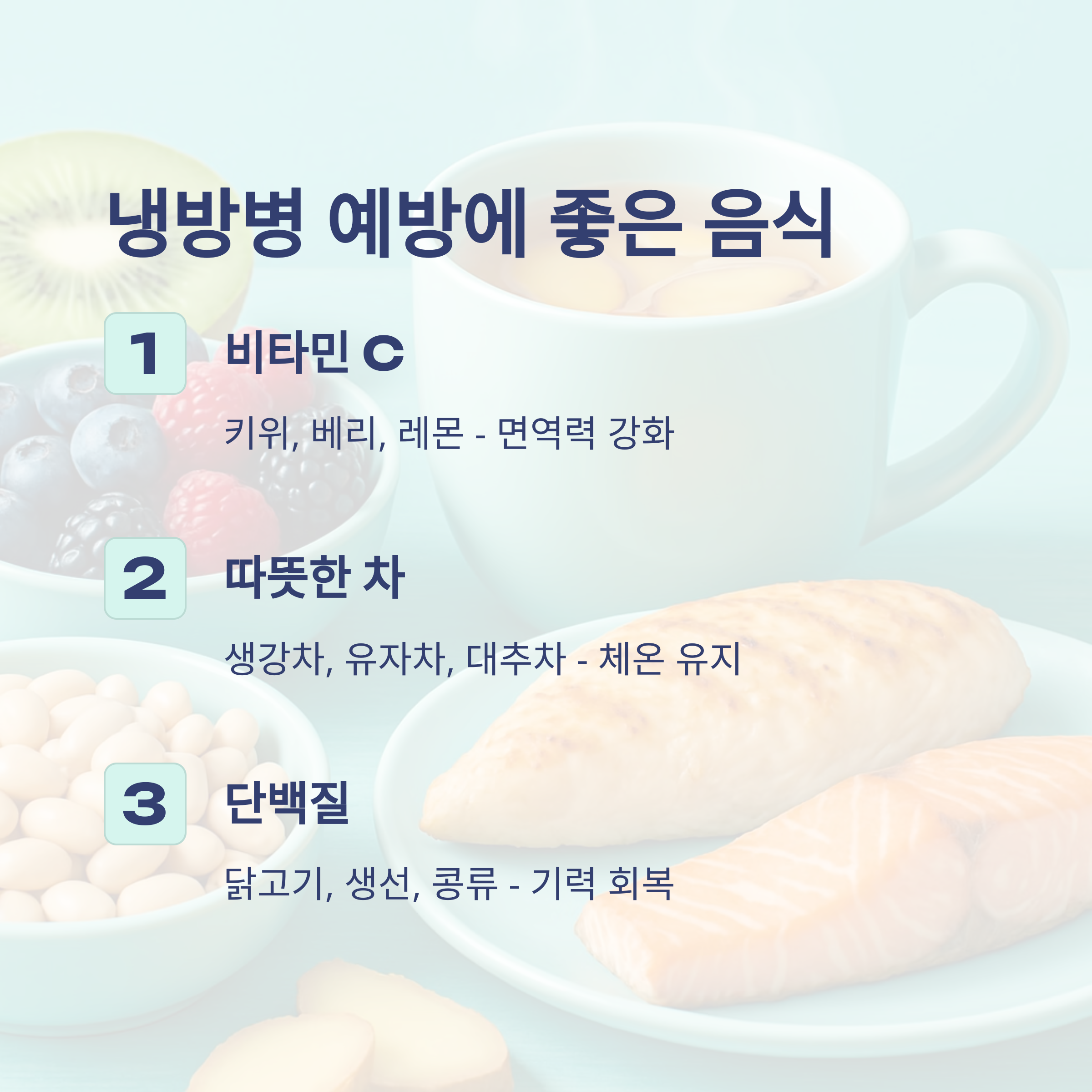 | 닭고기, 생선, 콩류 | 단백질 보충, 기력 회복 |