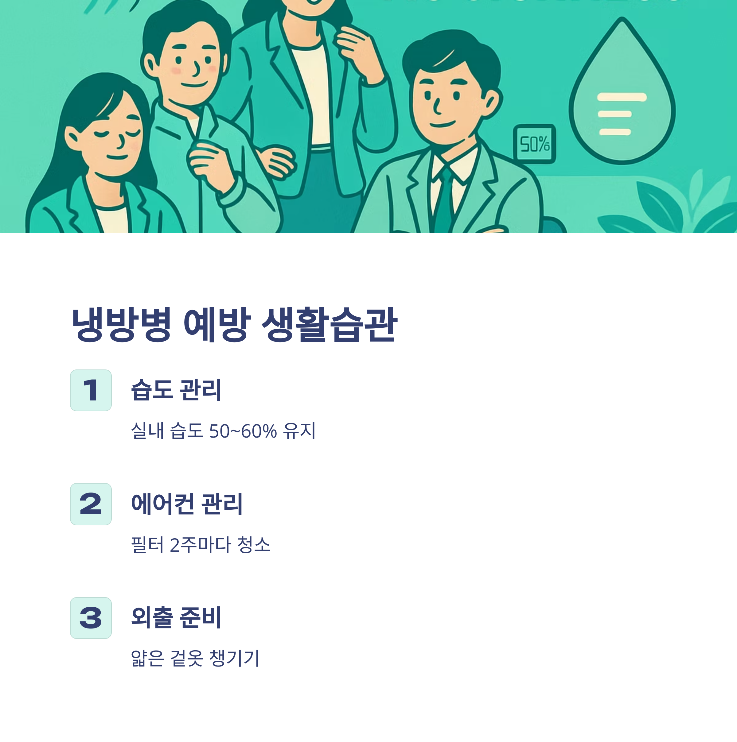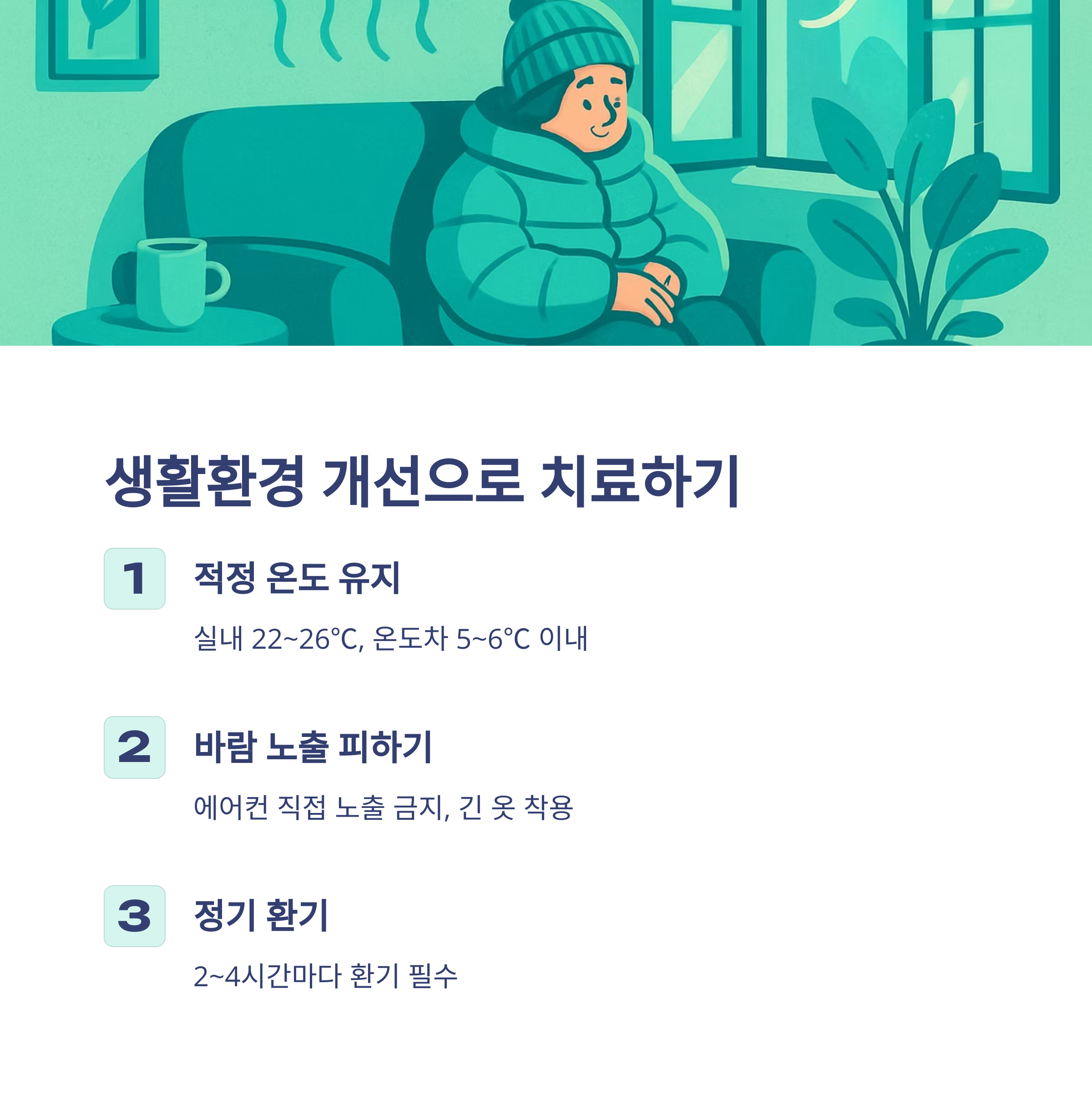 - 에어컨 바람 직접 노출 금지, 긴 옷 착용